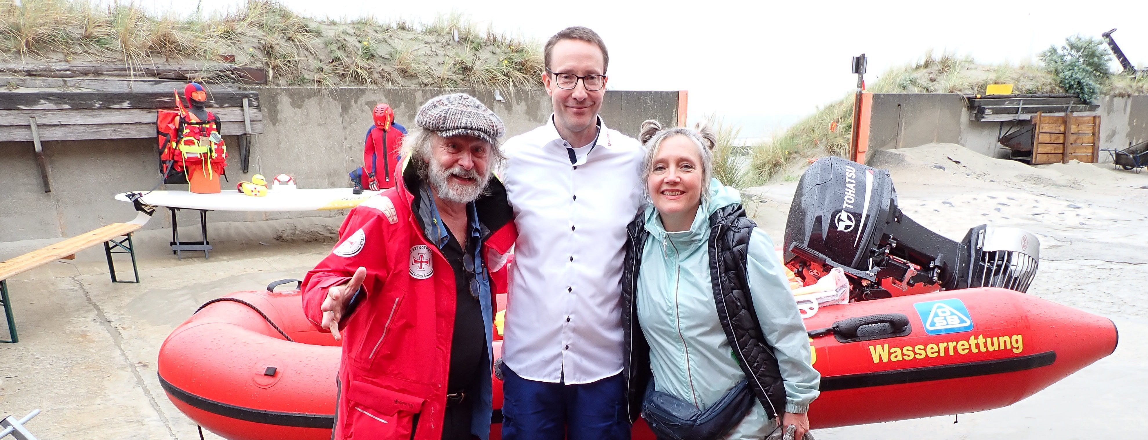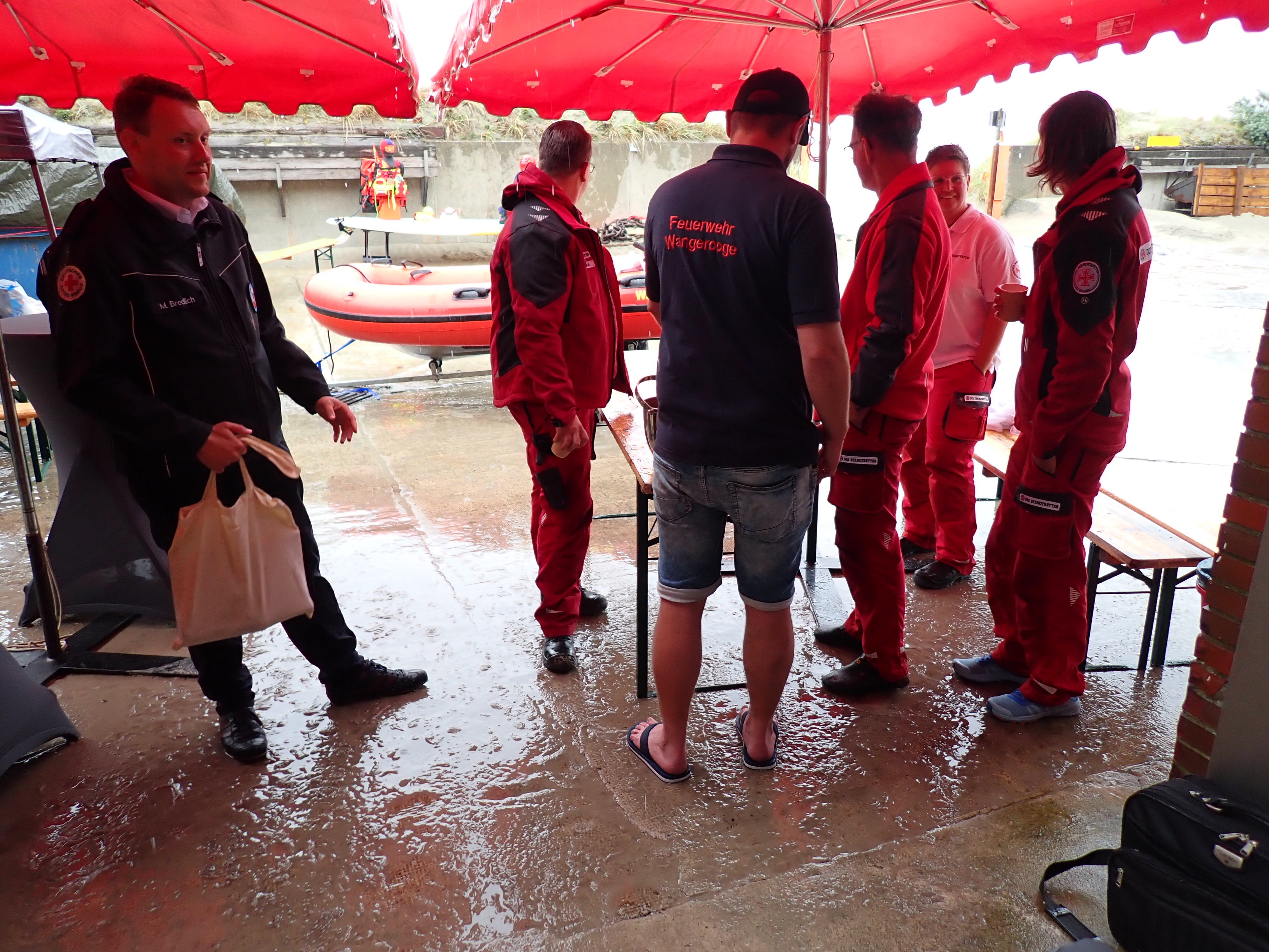 Pastor Jansen und Pfarrer Schlotmann gaben vor der Taufzeremonie Segensworte ab und wünschten den zukünftigen Besatzungen allzeit gute Fahrt und sicheres Heimkommen. Insgesamt war die ganze Blaulichtfamilie der Insel eingeladen und feierte mit der DLRG Ortsgruppe die Taufe.